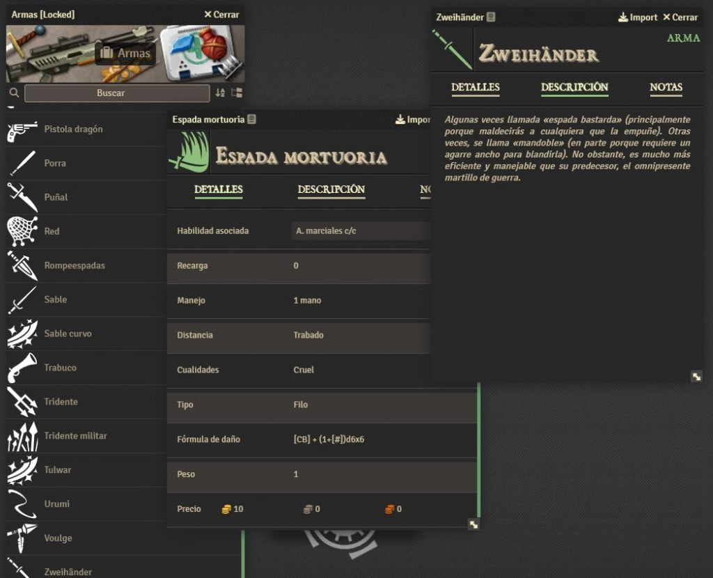 En esta nueva versión, se ha incluido información de todos los objetos disponibles tanto del libro básico de Zweihänder (disponible en tu tienda habitual) como de Main Gauche (Disponible en DriveThruRPG ), para que los puedas incluir en tus partidas fácilmente.