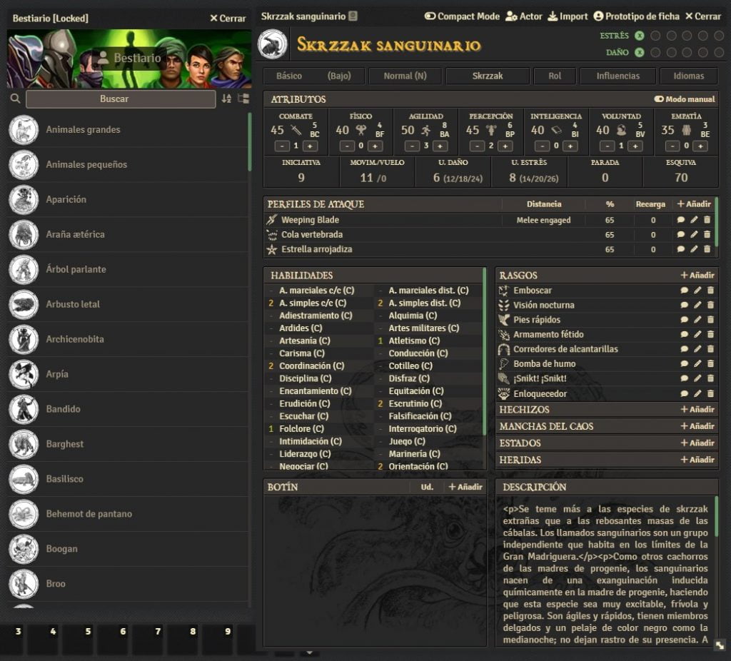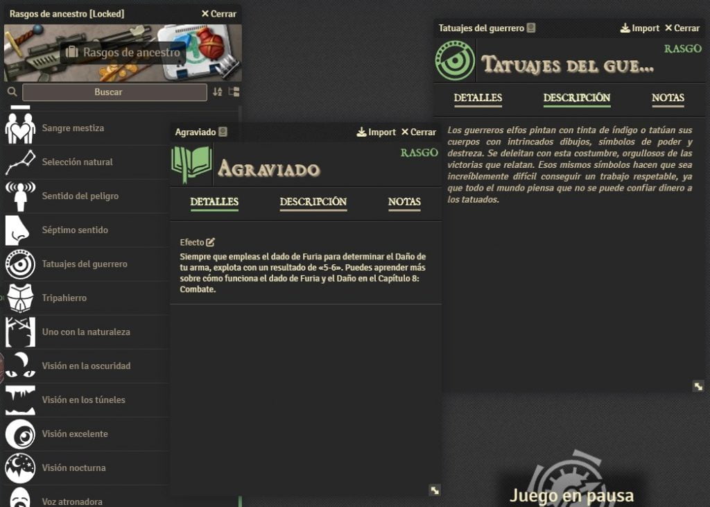 Todos estos objetos están organizados en lo que Foundry VTT llama compendios, divididos por tipos: ancestros, armas, rasgos, etc.