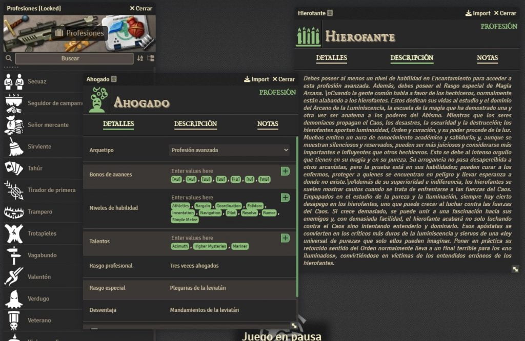 185 profesiones y profesiones avanzadas, con el arquetipo, los bonos de avances, niveles de habilidad, talentos, rasgos profesionales, rasgos especiales y desventajas