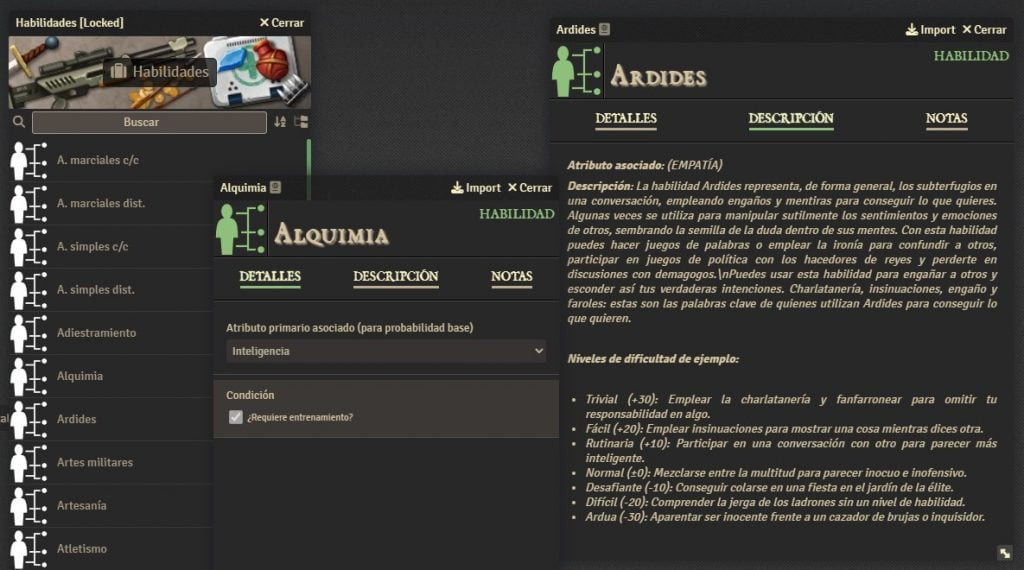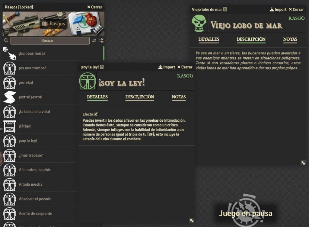 El módulo cuenta con una detallada hoja de personaje. Está se encuentra organizada en un bloque central con las características físicas del PJ, los puntos de recompensa, destino, reputación y un registro de los puntos de corrupción. Además dispone de una serie de pestañas con mucha más información: atributos, niveles, enseres, males y trasfondo.